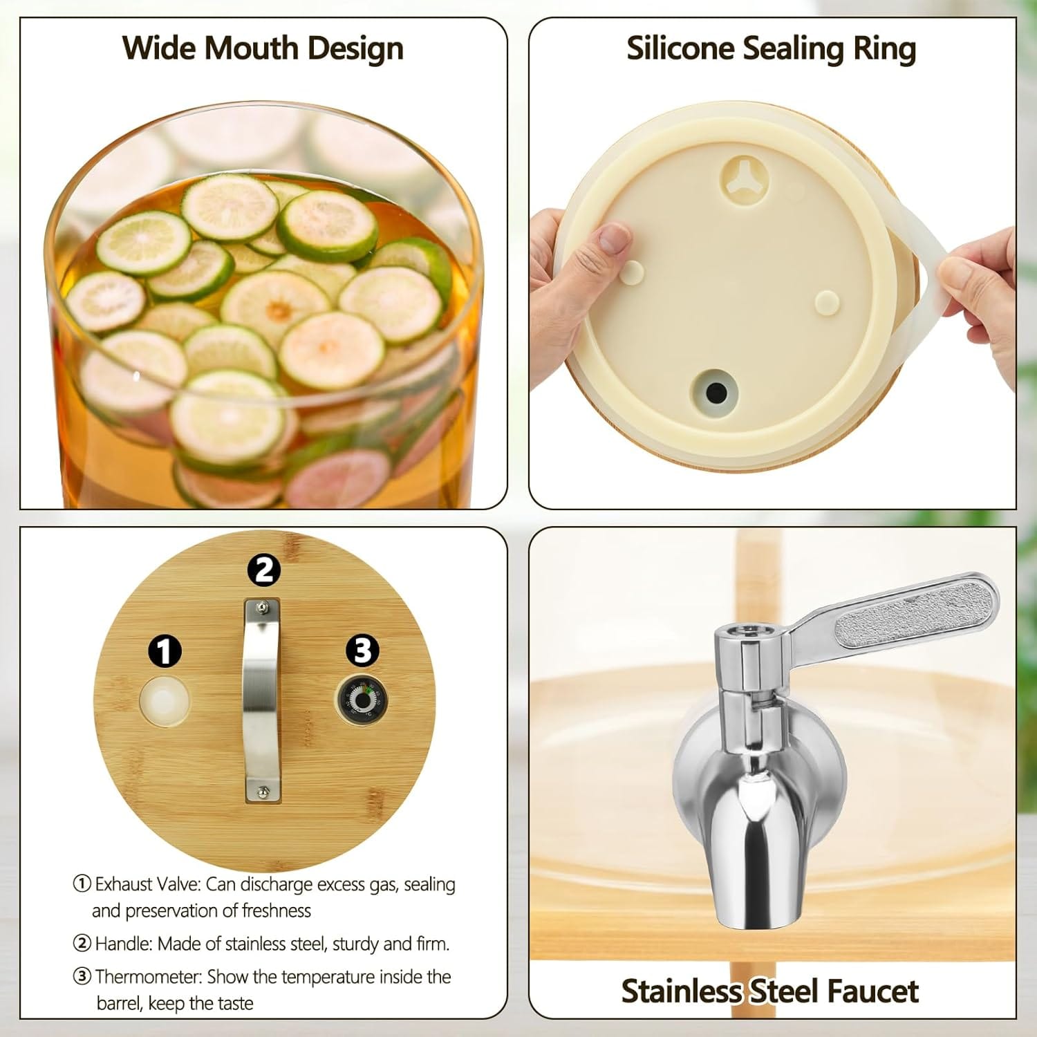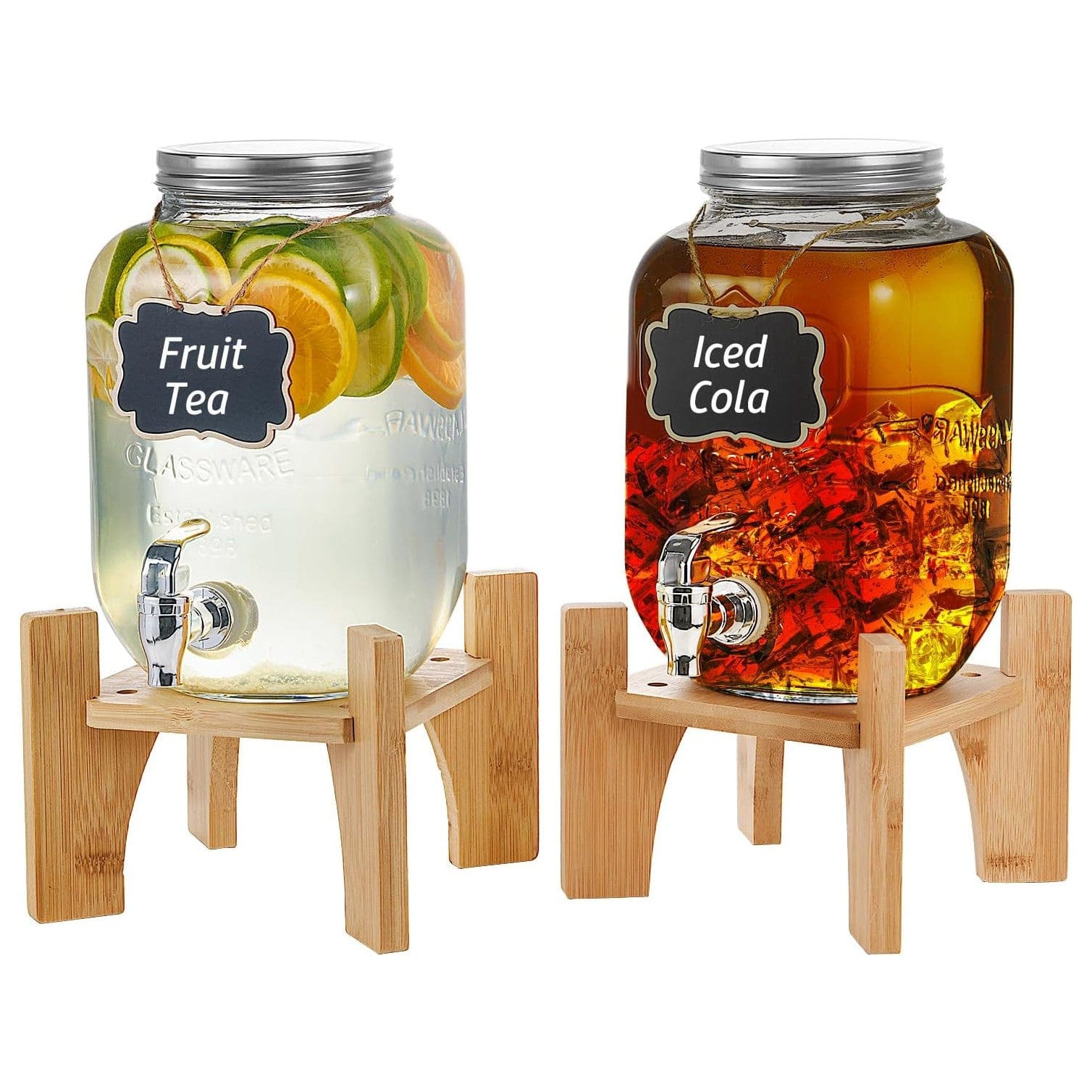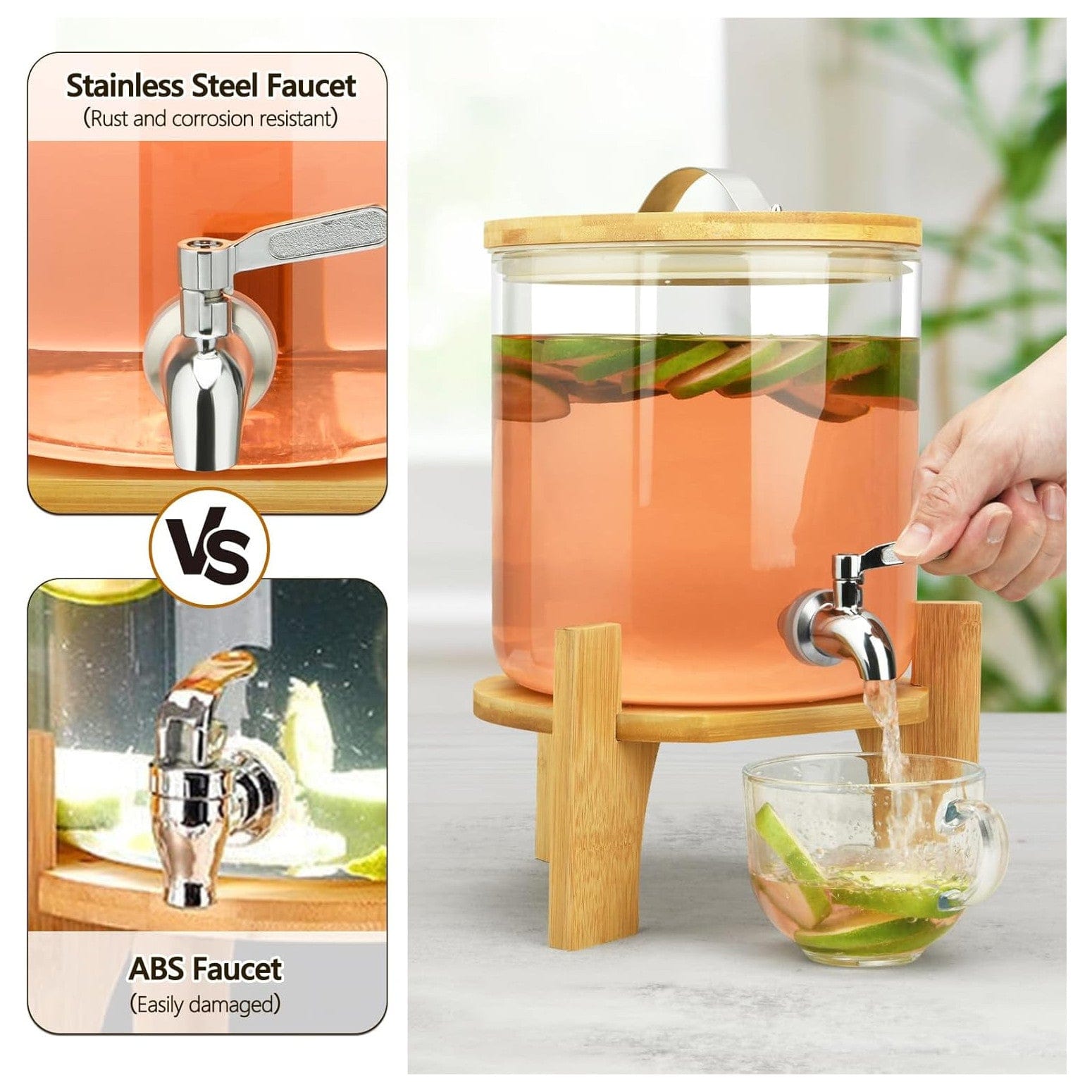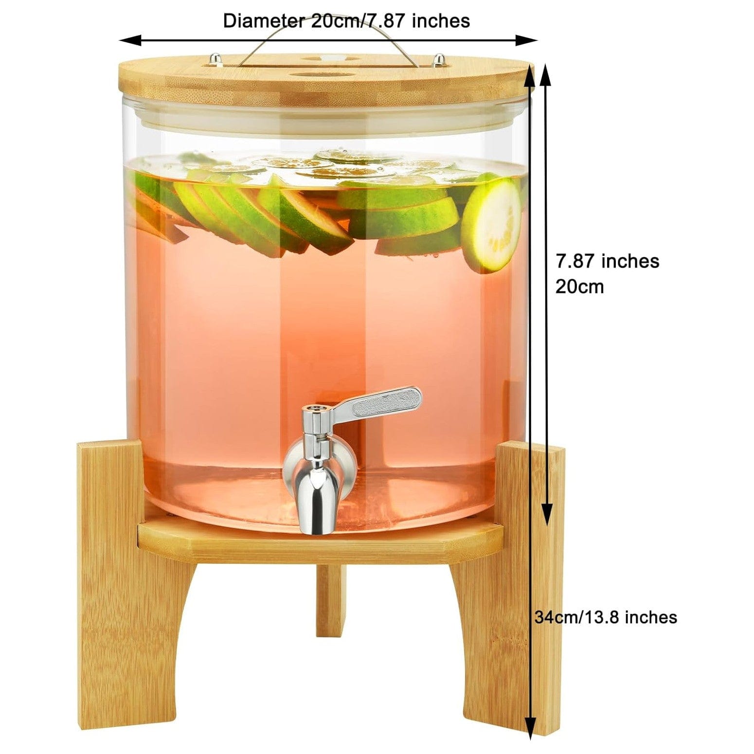 - Stabiler Getränkespender aus hochwertigem, dickem Glas, kälte- und hitzebeständig, nicht leicht zu brechen. Mit einem Fassungsvermögen von 5 Litern, einem Hahn aus Edelstahl, einem Deckel aus Bambusholz und einem Ständer.