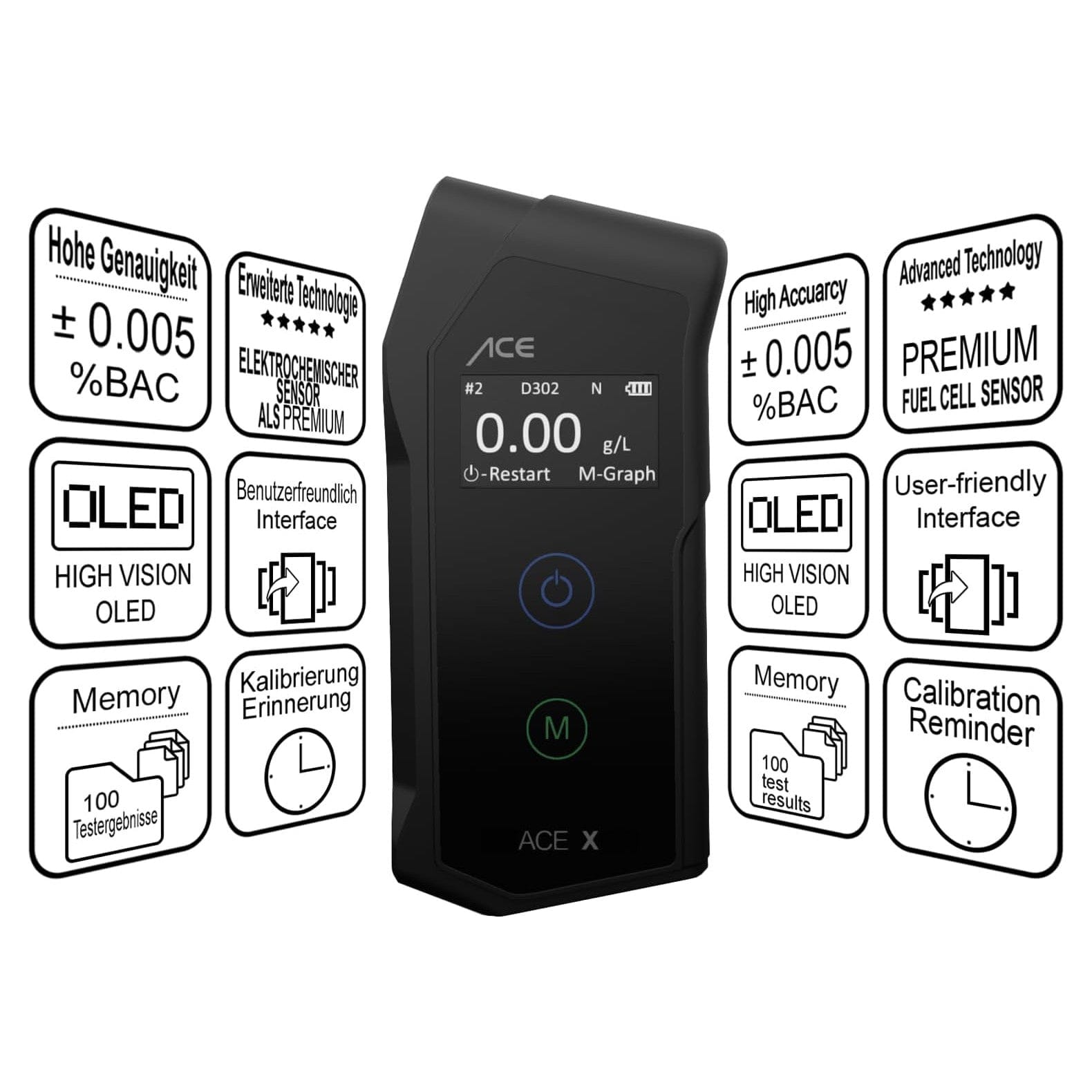 - KONFIGURIERBAR: Der Alkoholtester ACE X stellt die Messwerte grafisch dar und bietet neben einer Kalibriererinnerung und einem Speicher für bis zu 100 Tests auch individuell einstellbare Alarmgrenzen