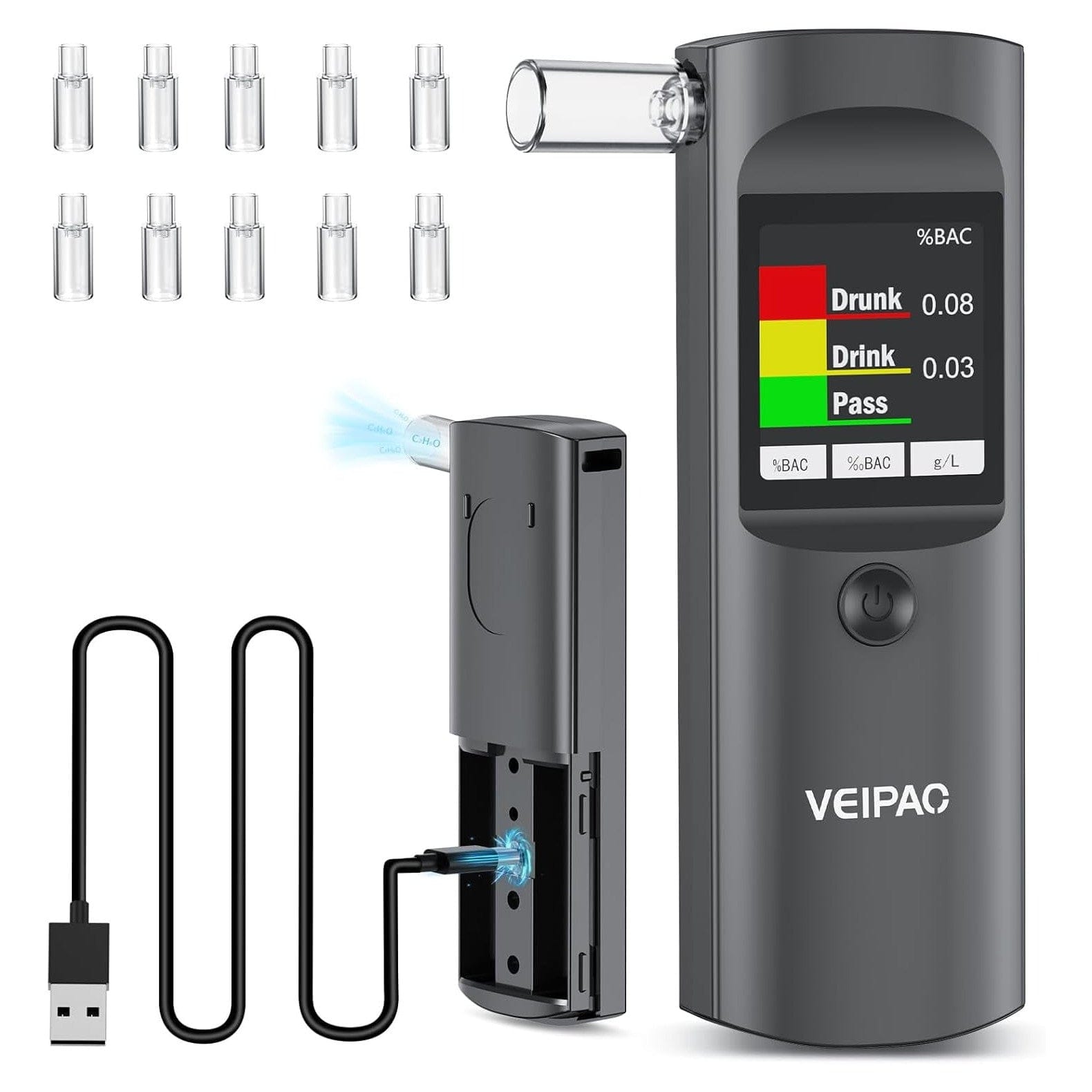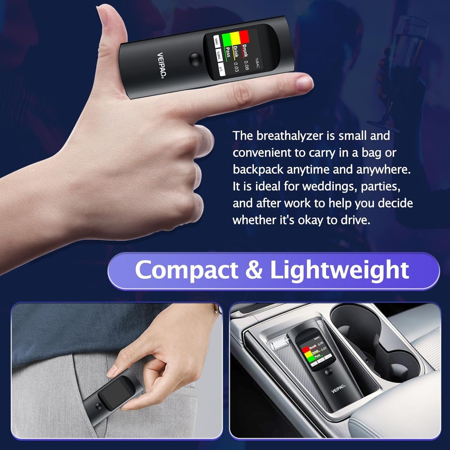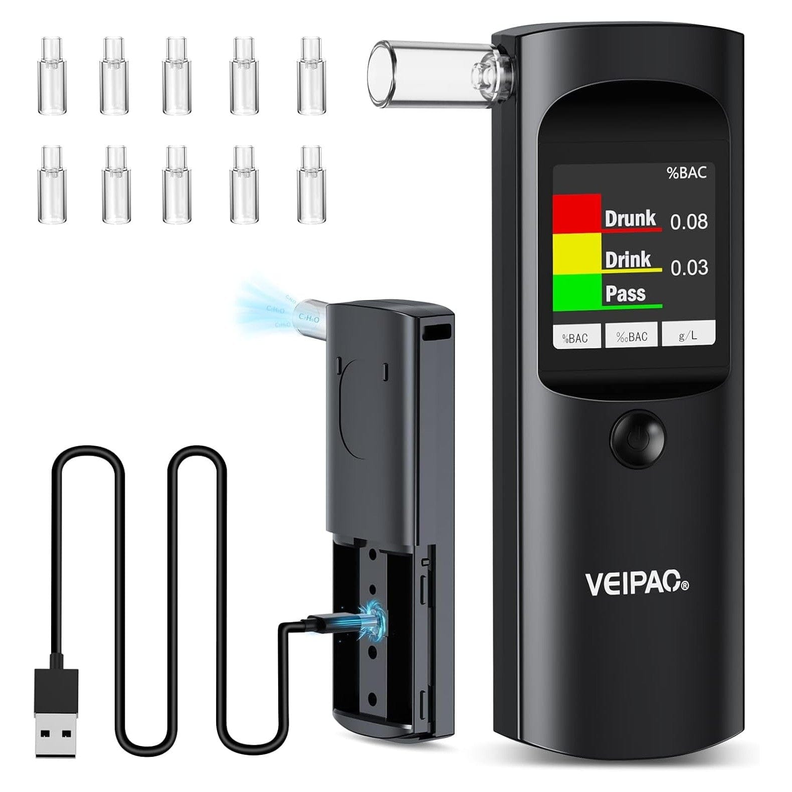 Der Alkoholmessgerät ist nur 4,7 x 1,6 x 0,7 Zoll groß und wiegt nur 65 g. Er lässt sich leicht in Ihrer Handtasche oder Tasche tragen und Sie können ihn überallhin mitnehmen. Perfekt, um Ihren Alkoholspiegel bei Hochzeiten, Partys, Banketten oder nach einem Drink an der Bar zu überprüfen. Das USB-Kabel ermöglicht es Ihnen, ihn schnell an Ihr Auto anzuschließen, um ohne Batterien zu testen.